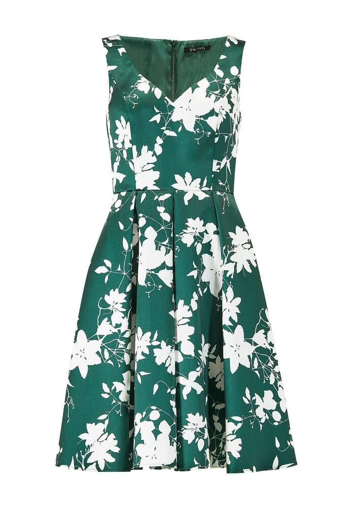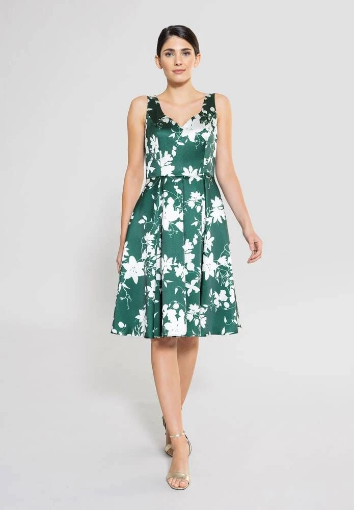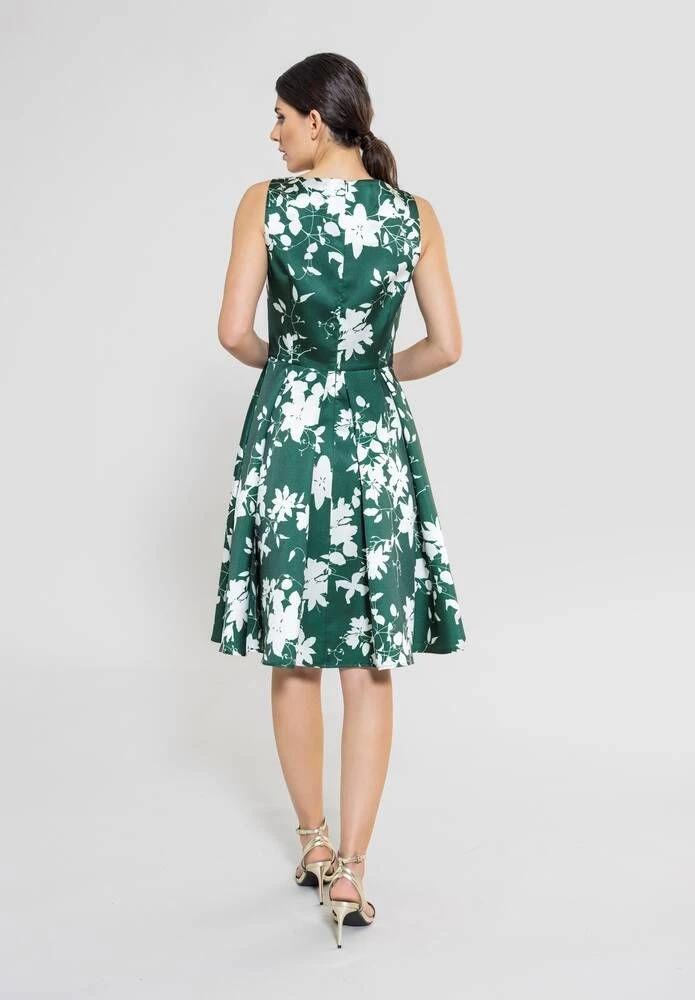 Naisten hihaton cocktailmekko kauniilla sydänpääntiellä. Leveässä helmassa on ihanat laskostukset. Selkäpuolen vetoketjukiinnitys helpottaa pukemista.
