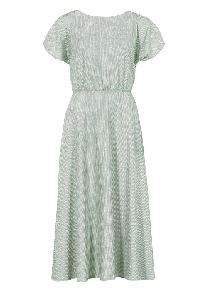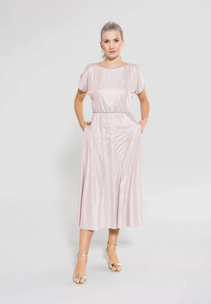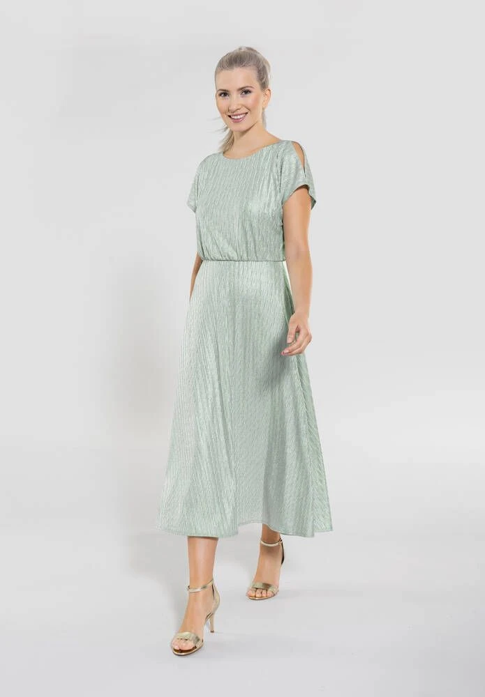 Naisten pastellisävyinen juhlamekko metallinhohtoisella päällikankaalla. Olkapäillä on tyylikkäät aukot ja vyötäröllä kätevät piilotaskut.