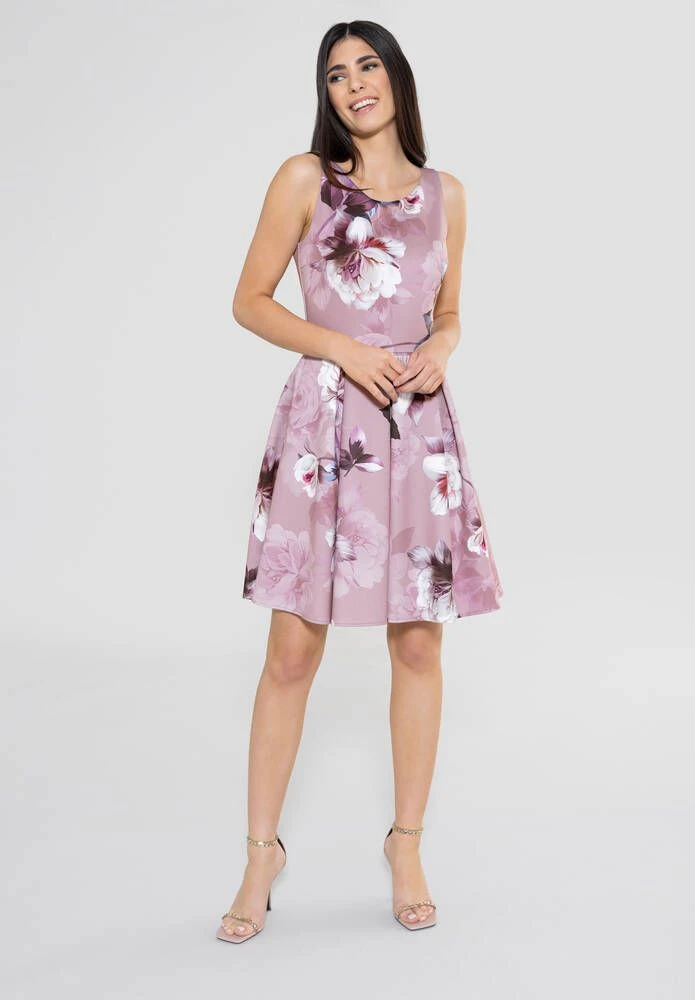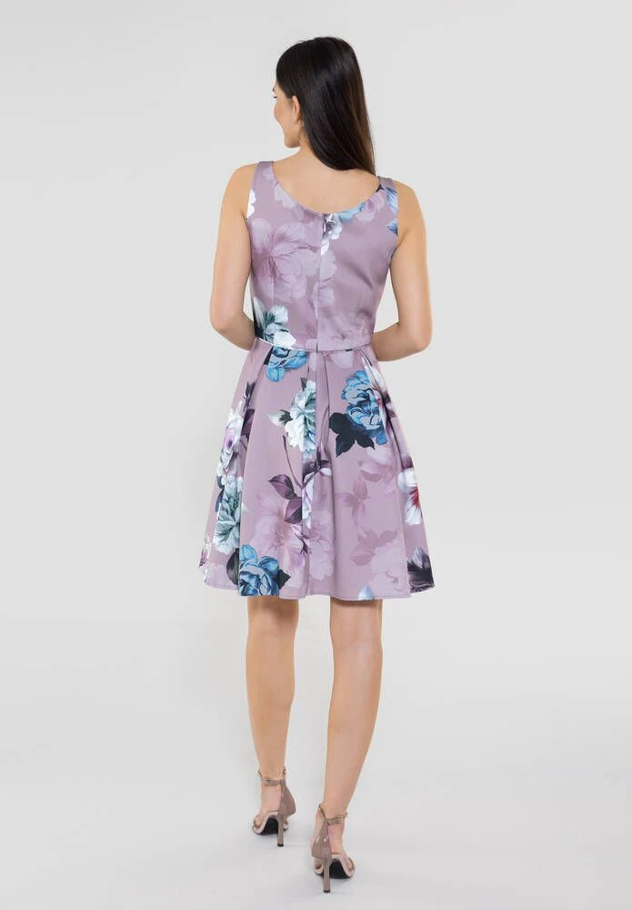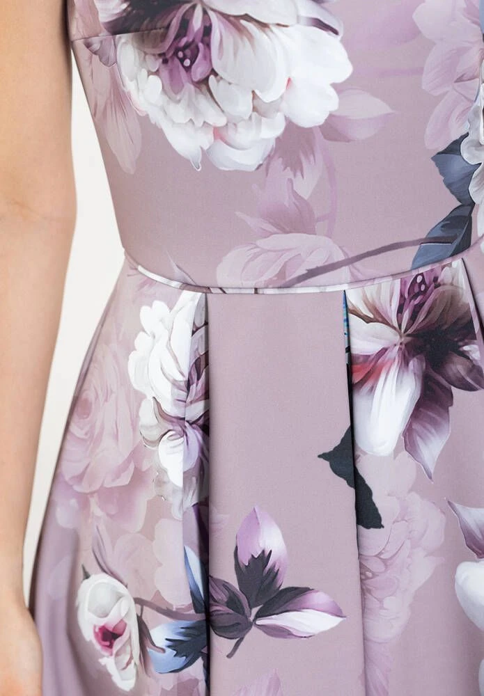 Naisten hihaton juhlamekko kauniilla kukkakuosilla. Mekon materiaali on miellyttävän joustavaa ja pääntie uurrettu selkäpuolelta V-aukoksi.