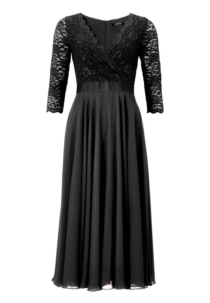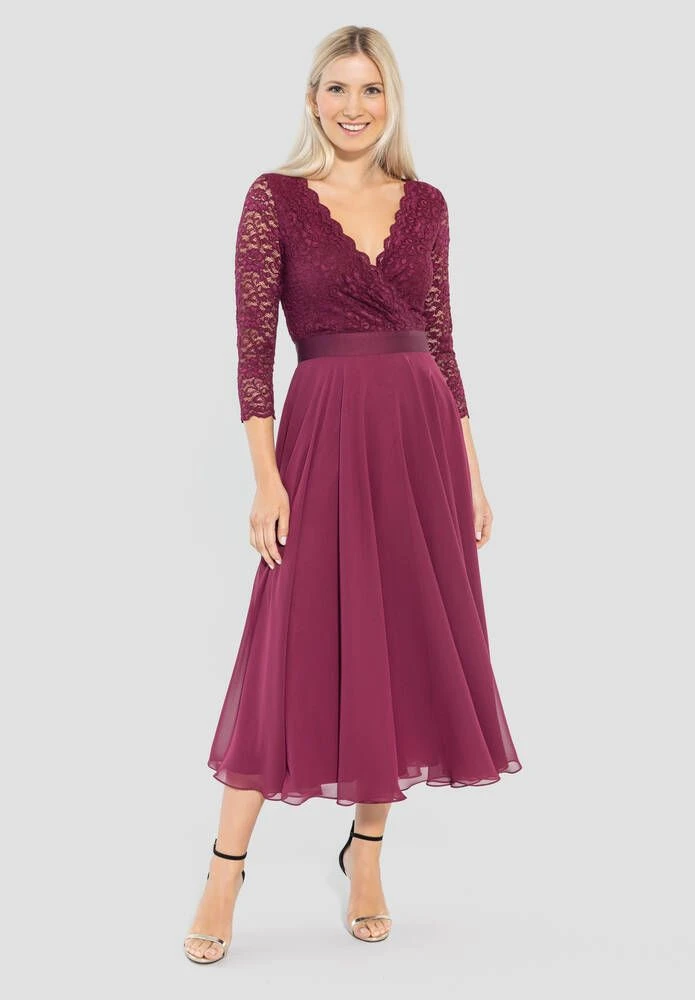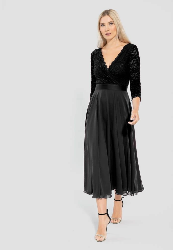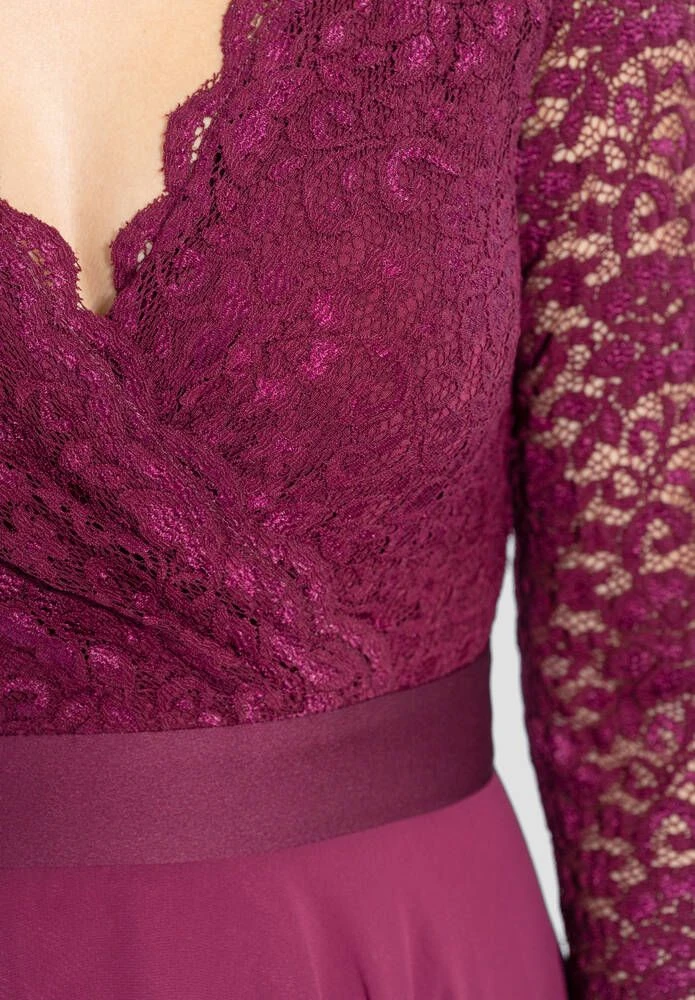 Naisten juhlamekko kietaisumallisella pitsiyläosalla ja levenevällä sifonkisella helmalla.