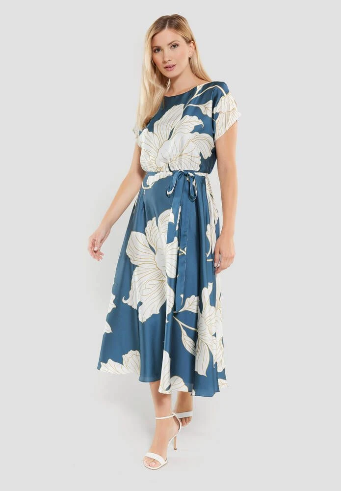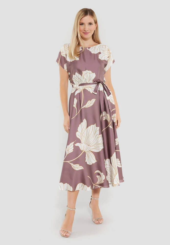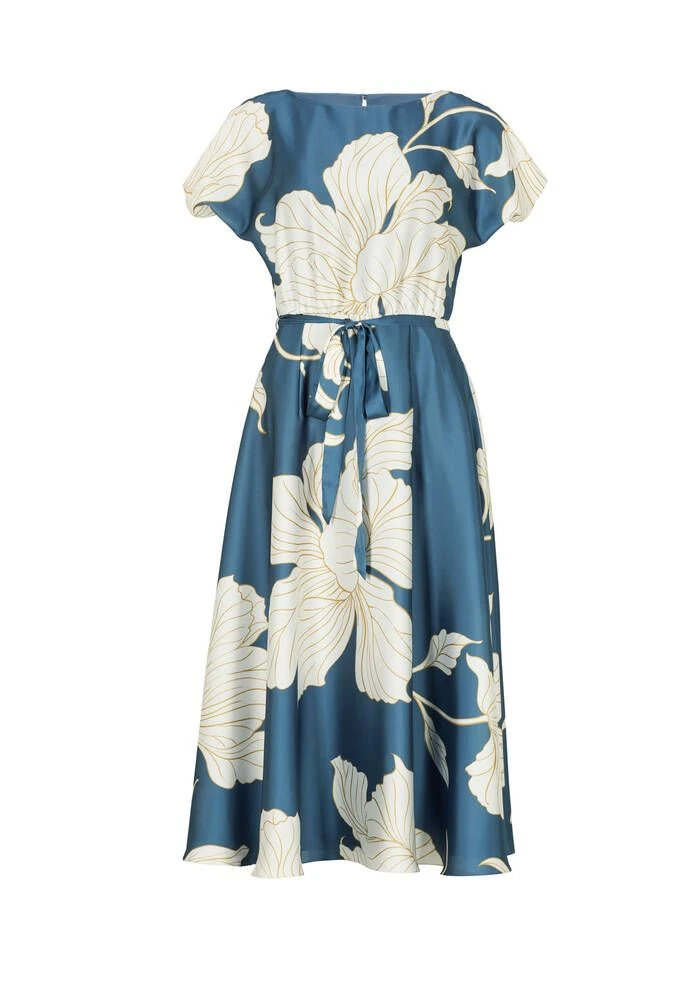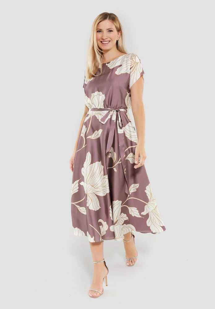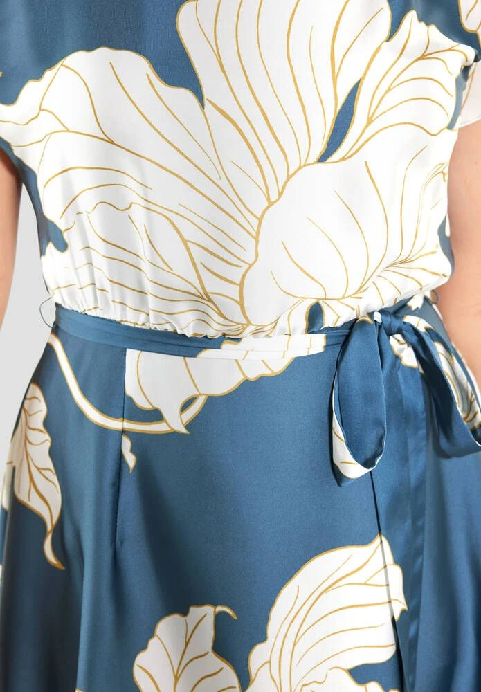 Naisten satiininen juhlamekko kukkaprintillä. Mekossa on leveä kellohelma, lyhyet hihat ja ohut kangasvyö.