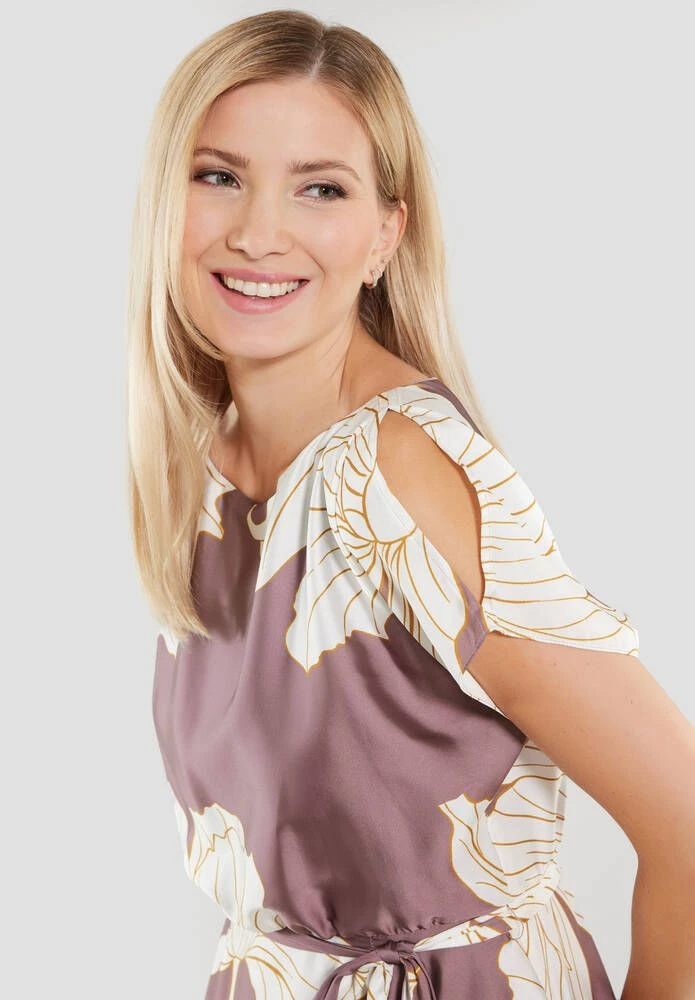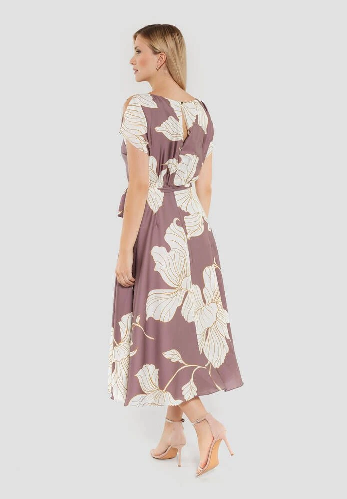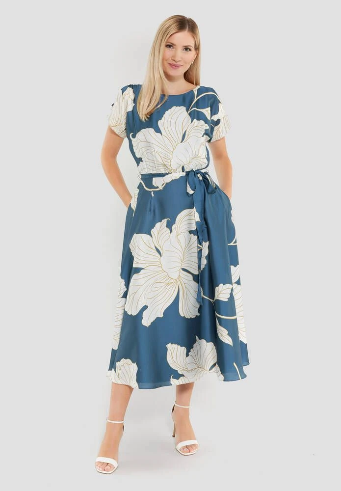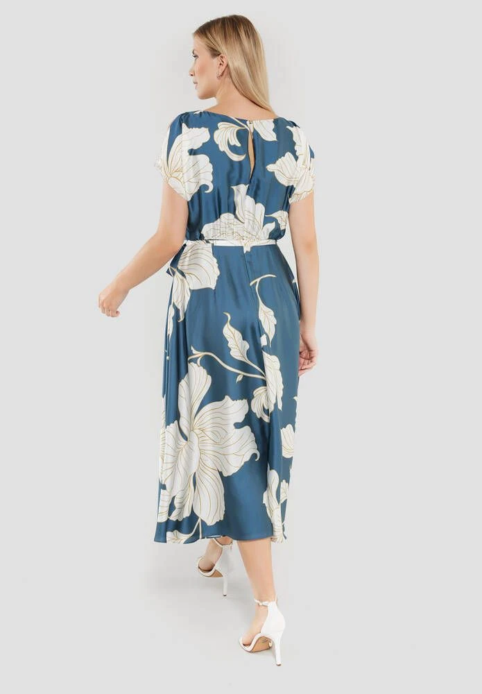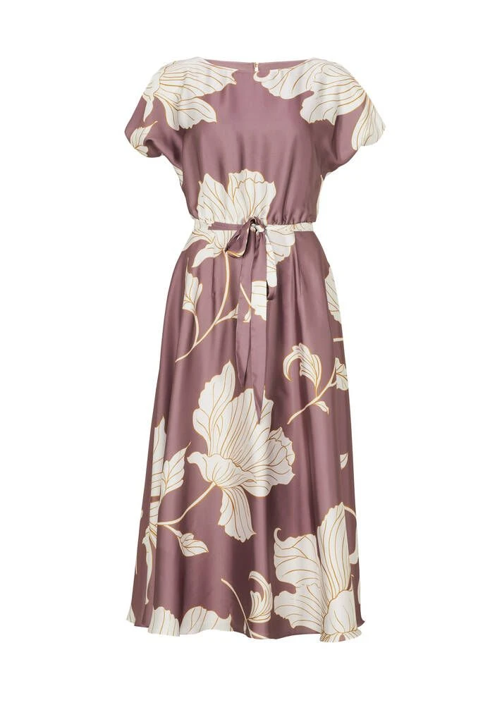 Naisten satiininen juhlamekko kukkaprintillä. Mekossa on leveä kellohelma, lyhyet hihat ja ohut kangasvyö.