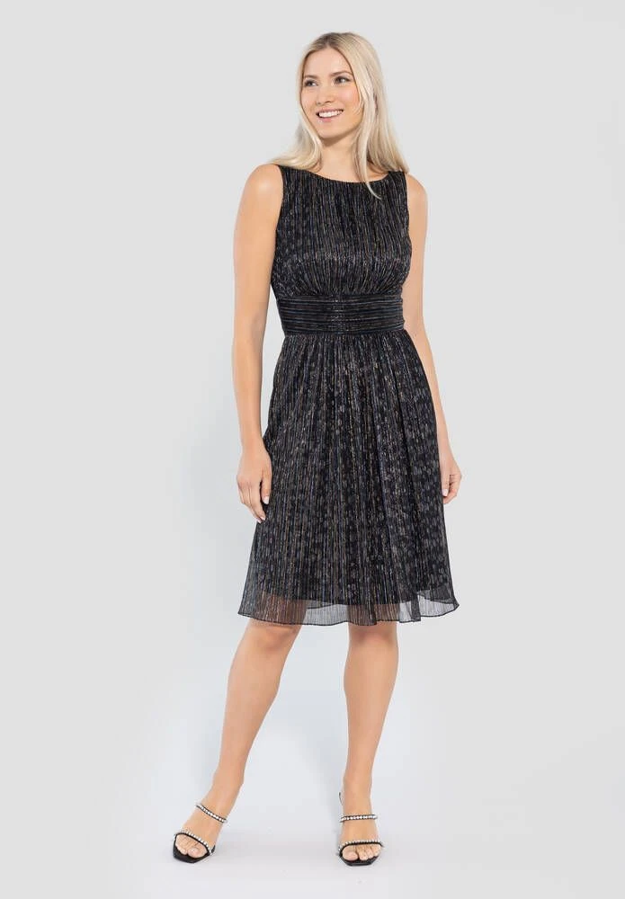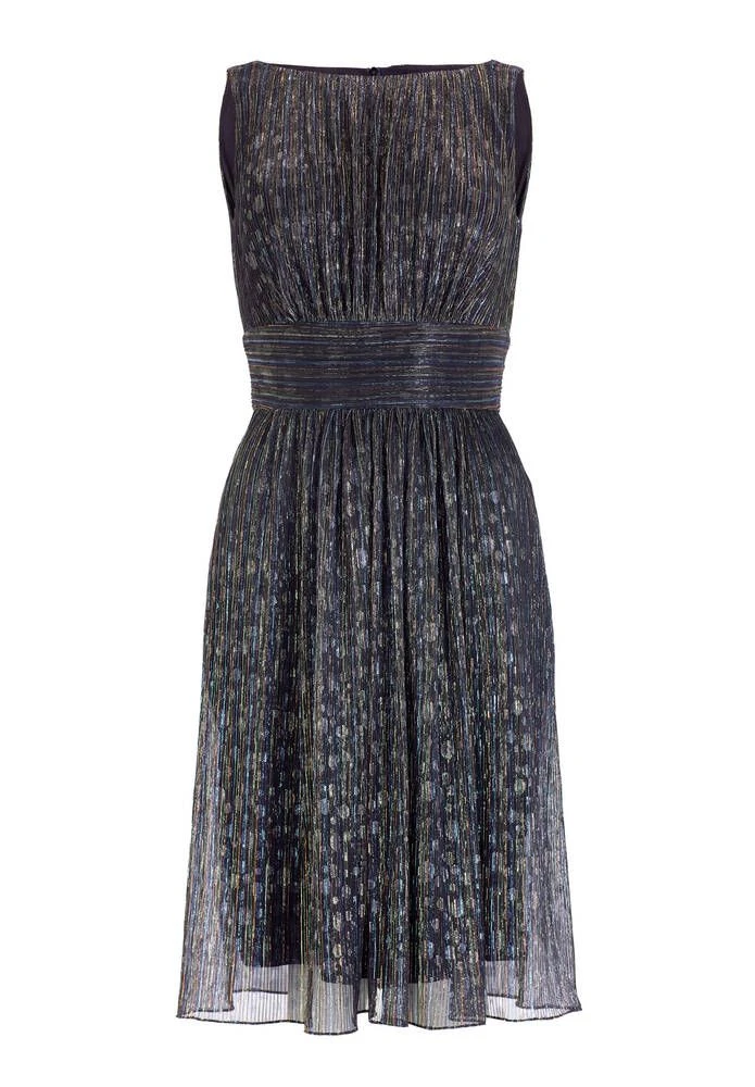 Naisten kiiltävä ja hihaton juhlamekko. Vaakaraidallinen vyötärökaistale tuo kauniisti vyötärön esille.
