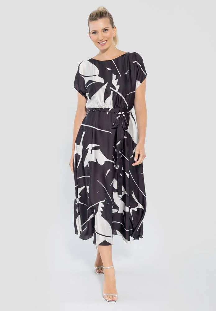 Naisten mustavalkoinen satiinimekko levenevällä helmalla. Mekossa on kangasvyö vyötäröllä ja taskut etupuolella.