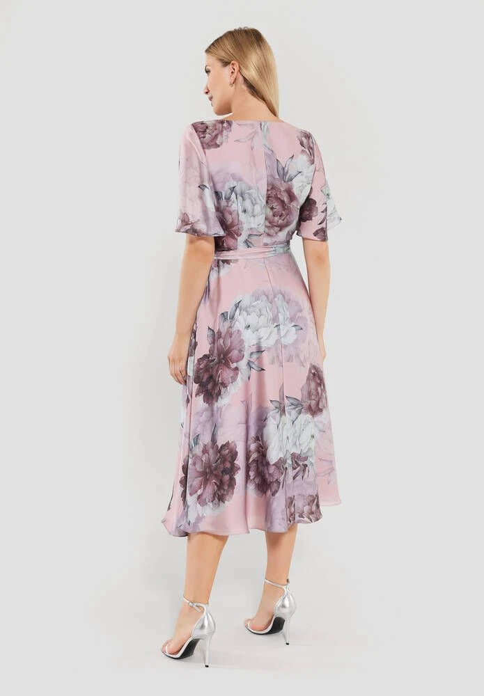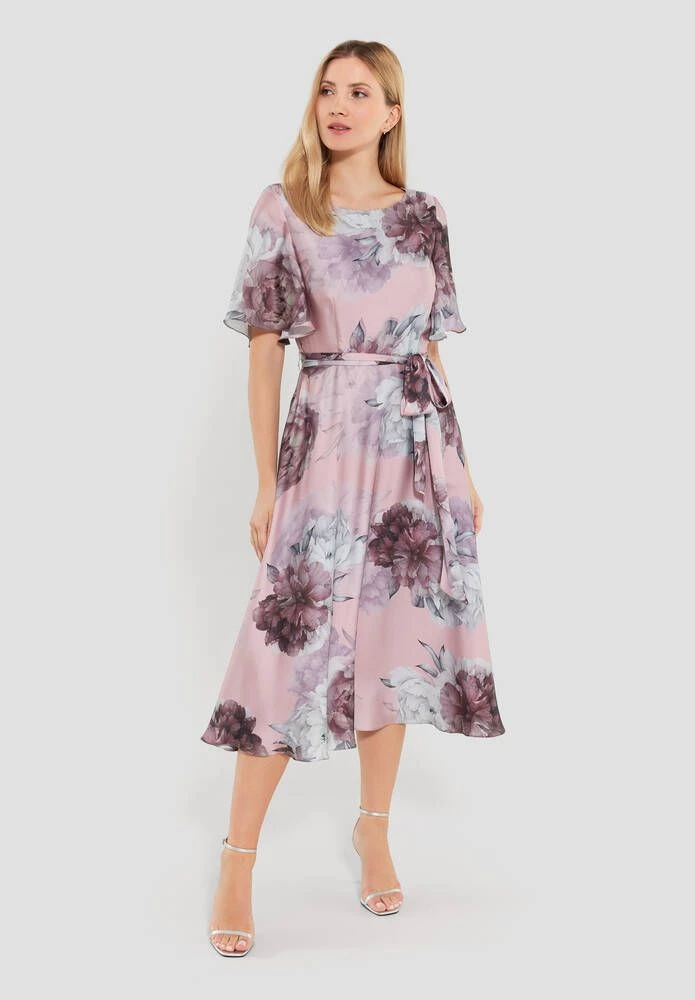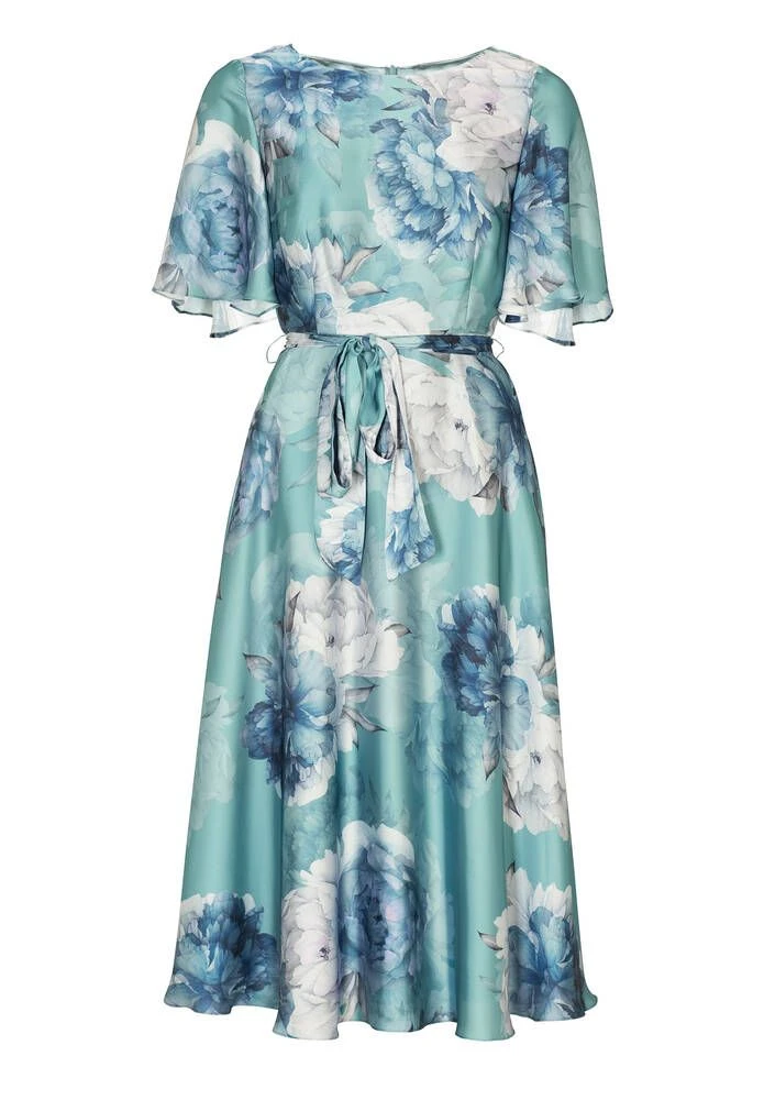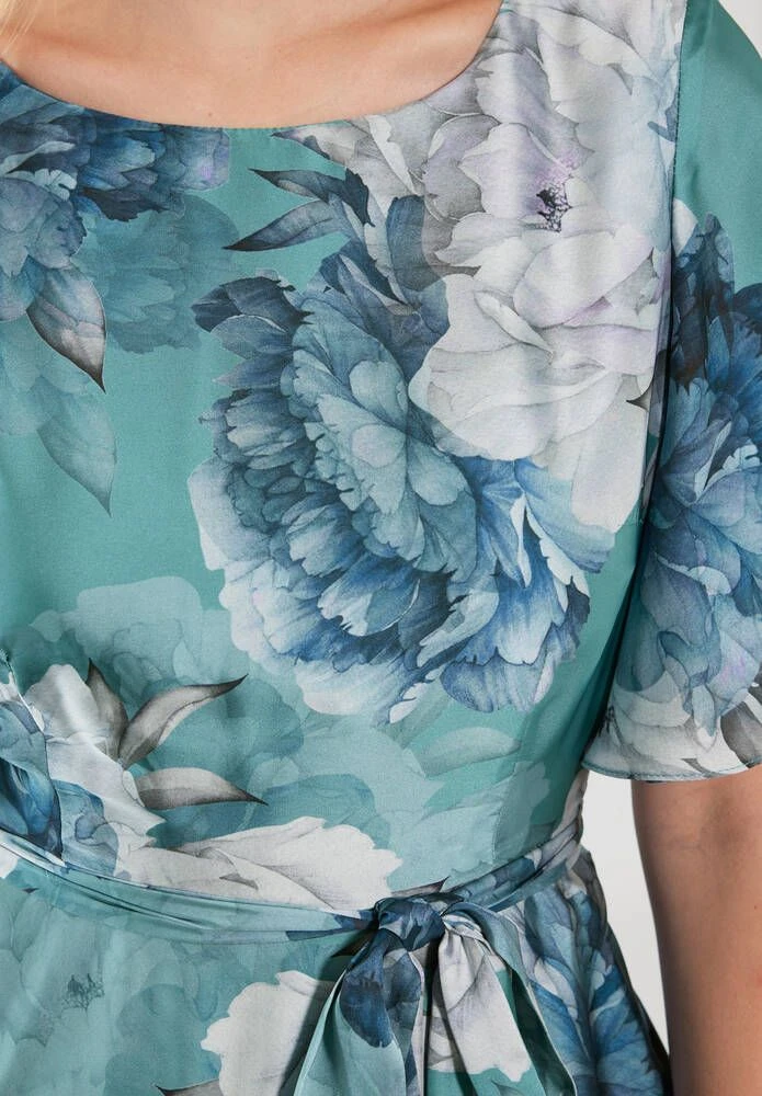 Naisten satiininen juhlamekko isolla kukkaprintillä ja vyötärölle solmittavalla nauhalla. Mekossa on leveä kellohelma ja lyhyet enkelihihat.