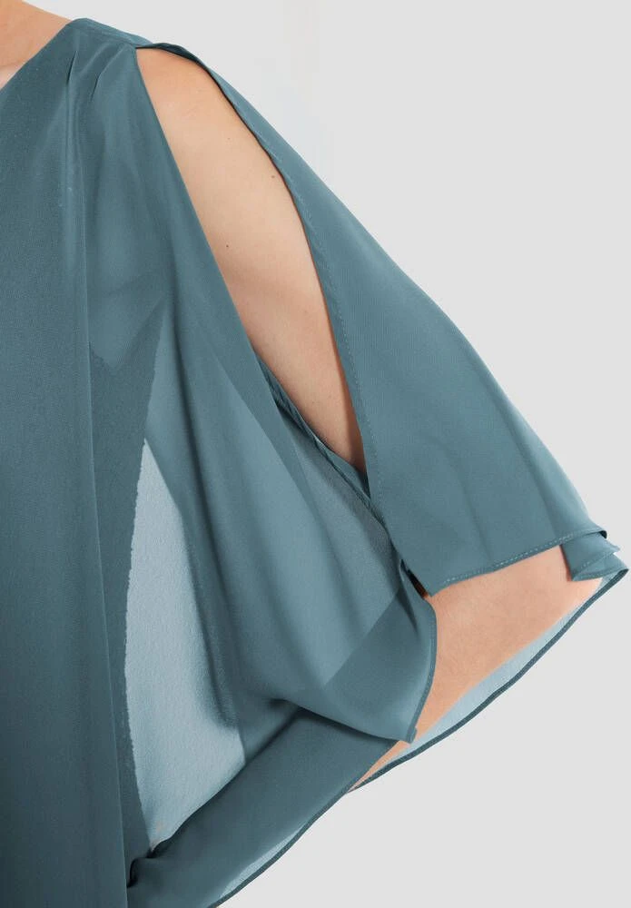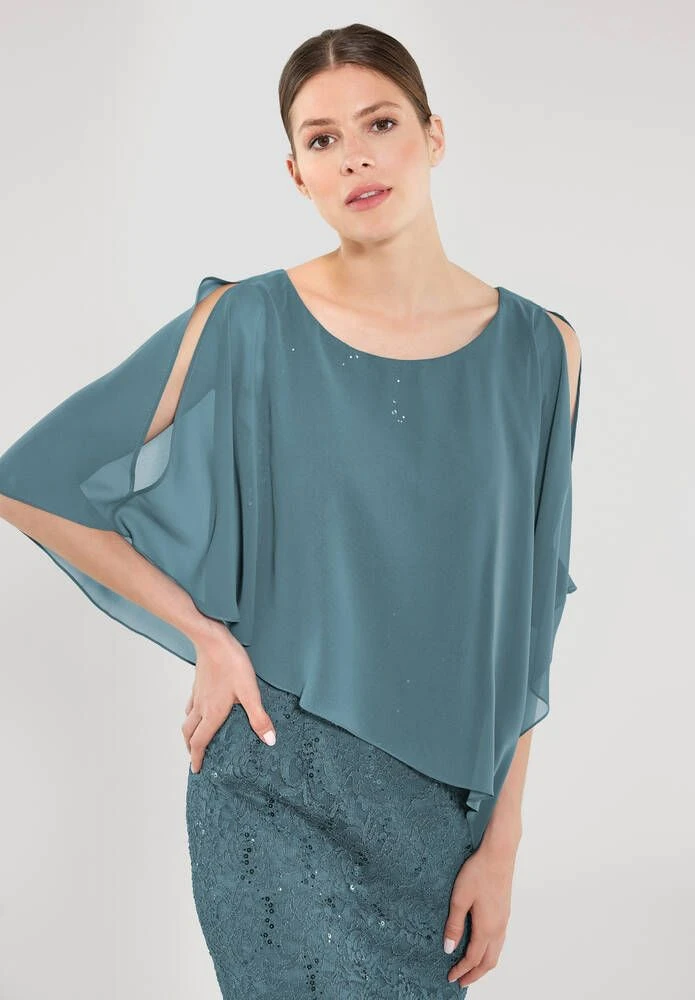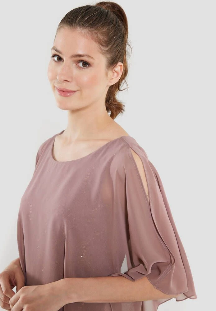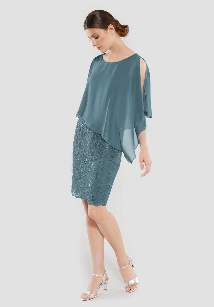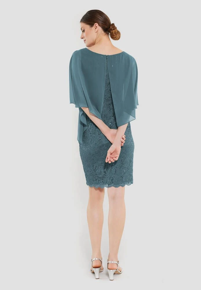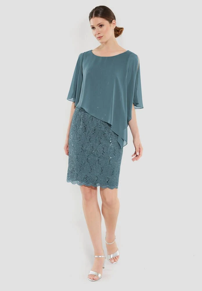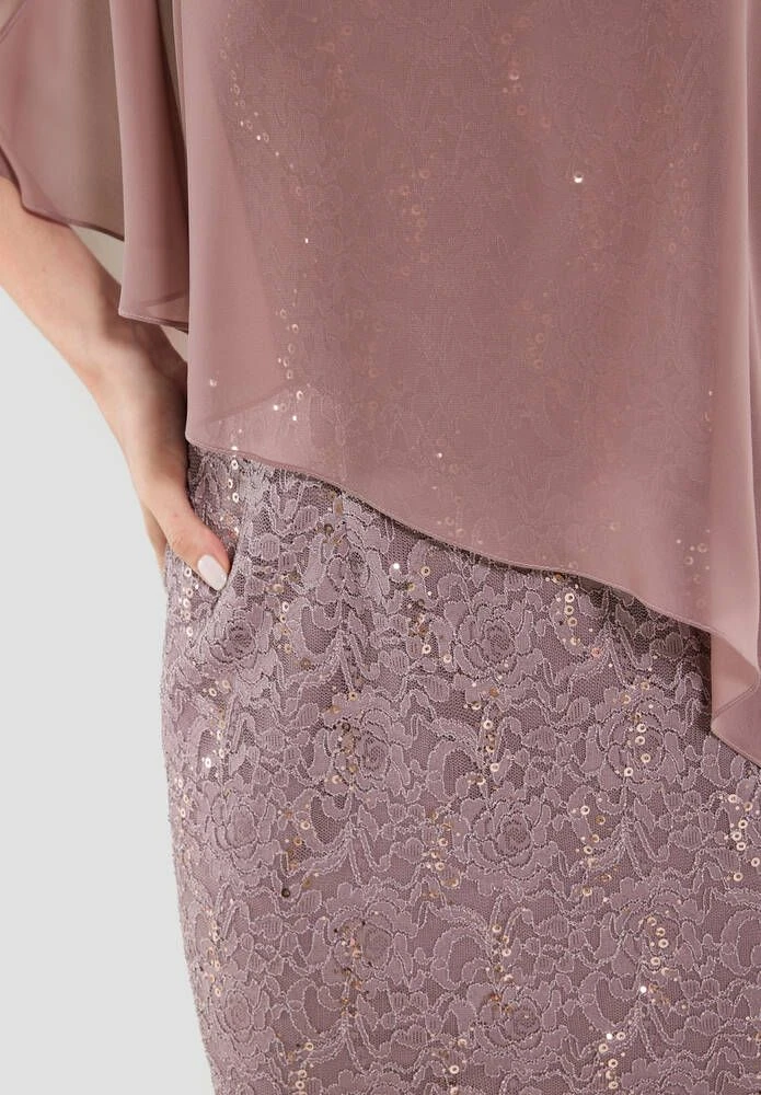 Hihaton pitsimekko, jonka päällä on läpikuultava sifonkiponcho. Kaunis pitsi on koristeltu kauttaaltaan kiiltävillä paljeteilla.
