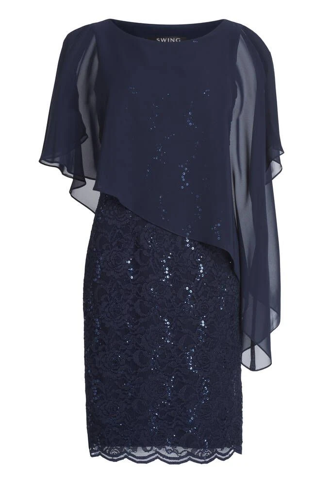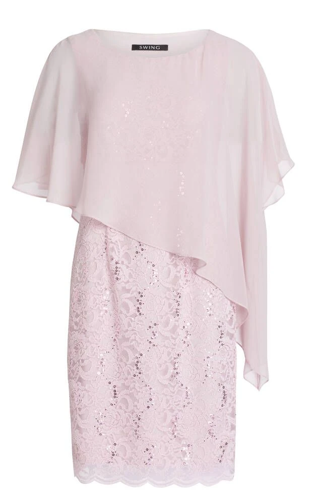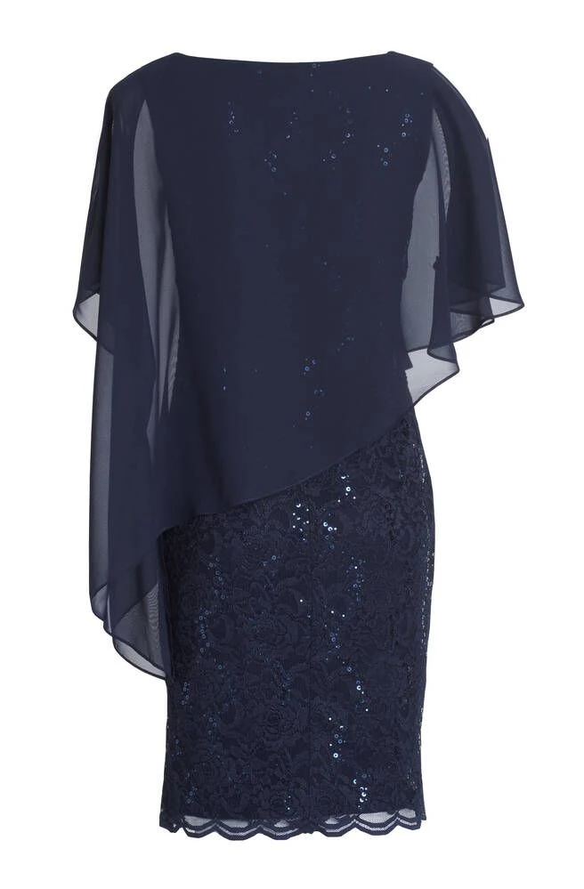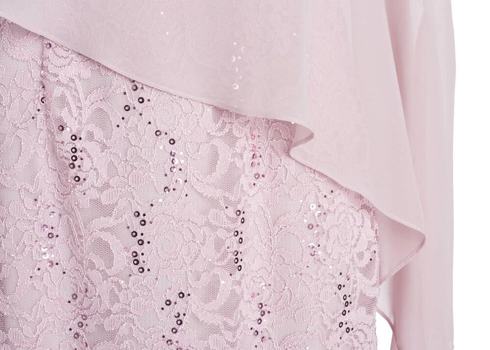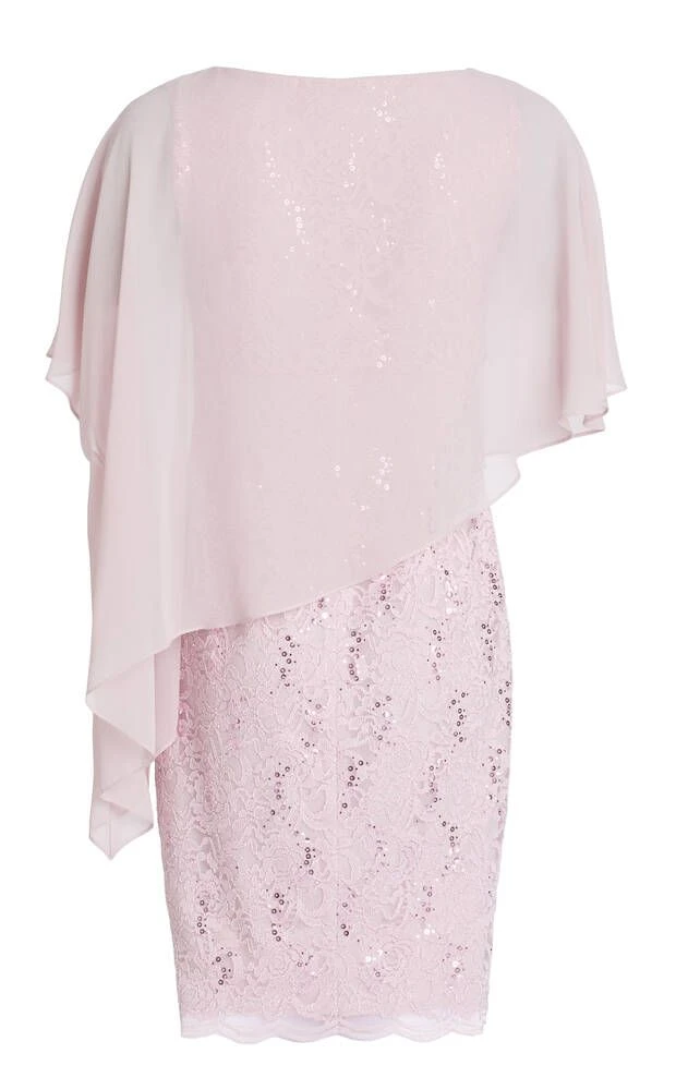 Hihaton pitsimekko, jonka päällä on läpikuultava sifonkiponcho. Kaunis pitsi on koristeltu kauttaaltaan kiiltävillä paljeteilla. Toisessa sivusaumassa on pukemista helpottava vetoketjukiinnitys.