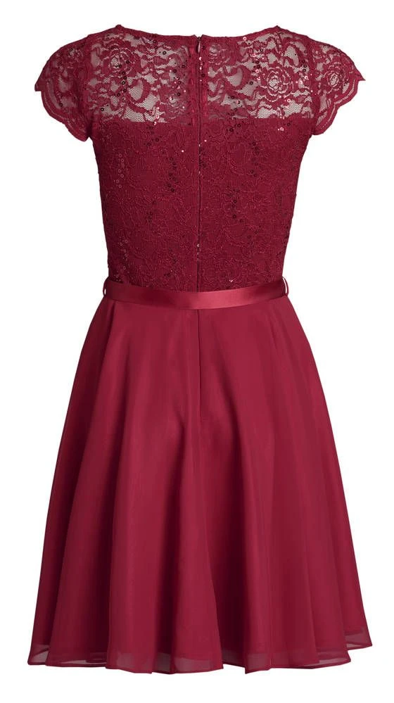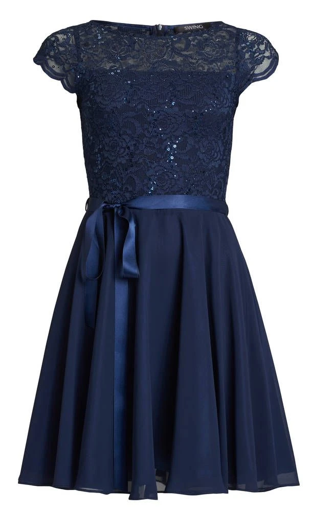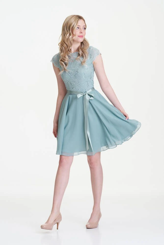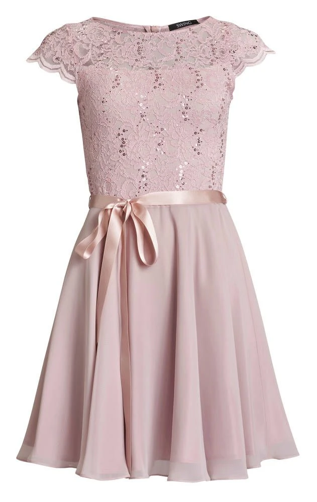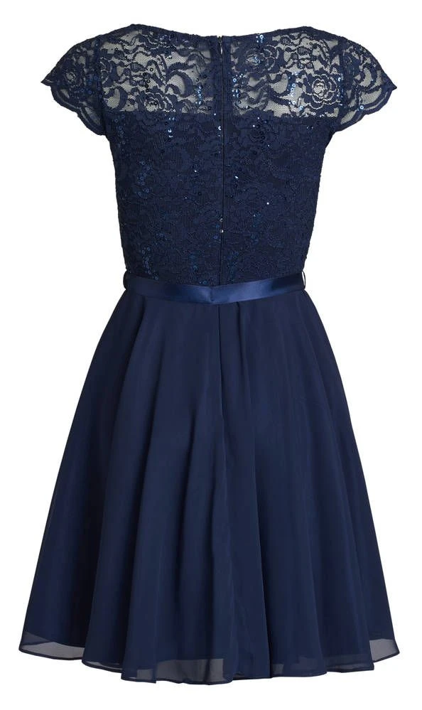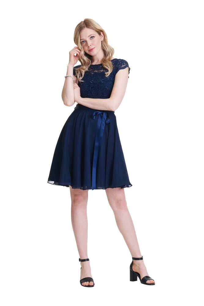 Ihana kellomekko pienillä hihoilla. Yksivärisessä mekossa on pitsinen yläosa ja leveä sifonkihelma. Yläosassa on lisäksi näyttävät paljettikoristeet.
