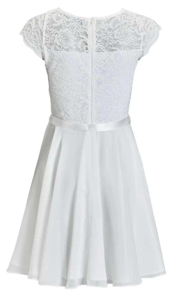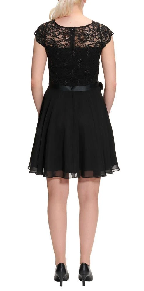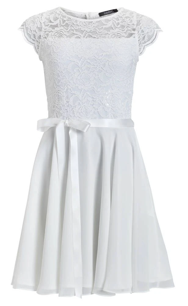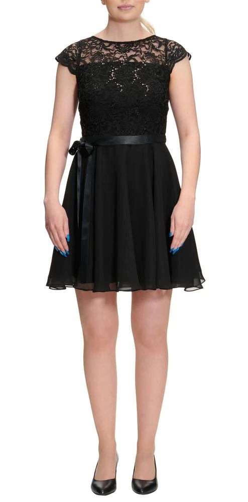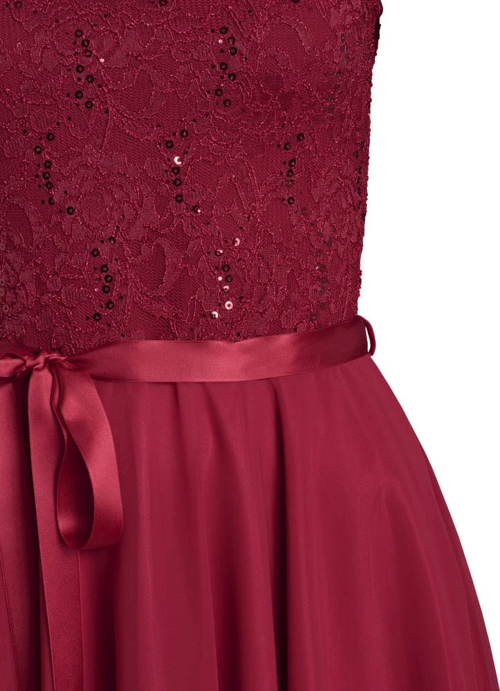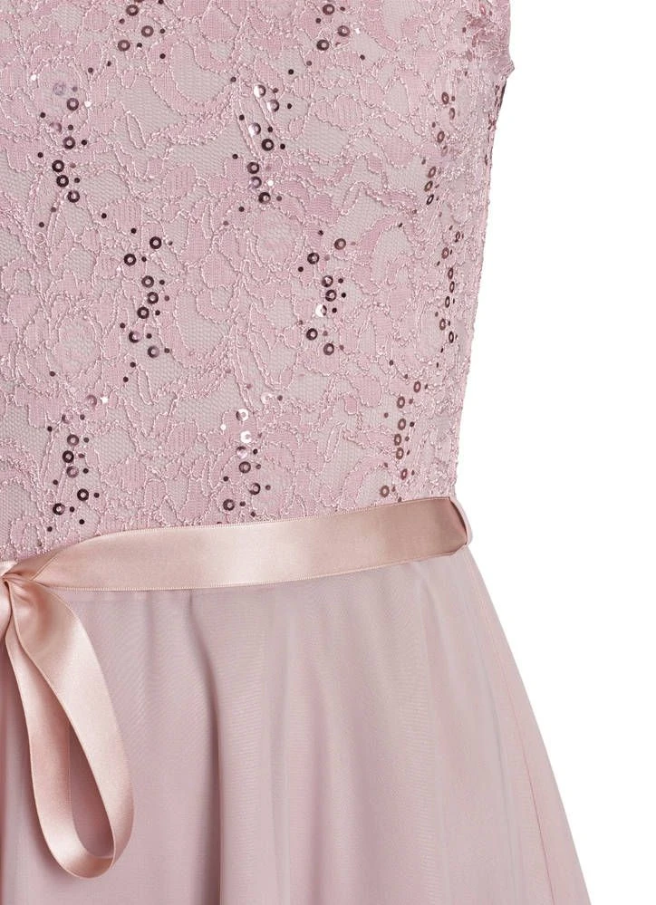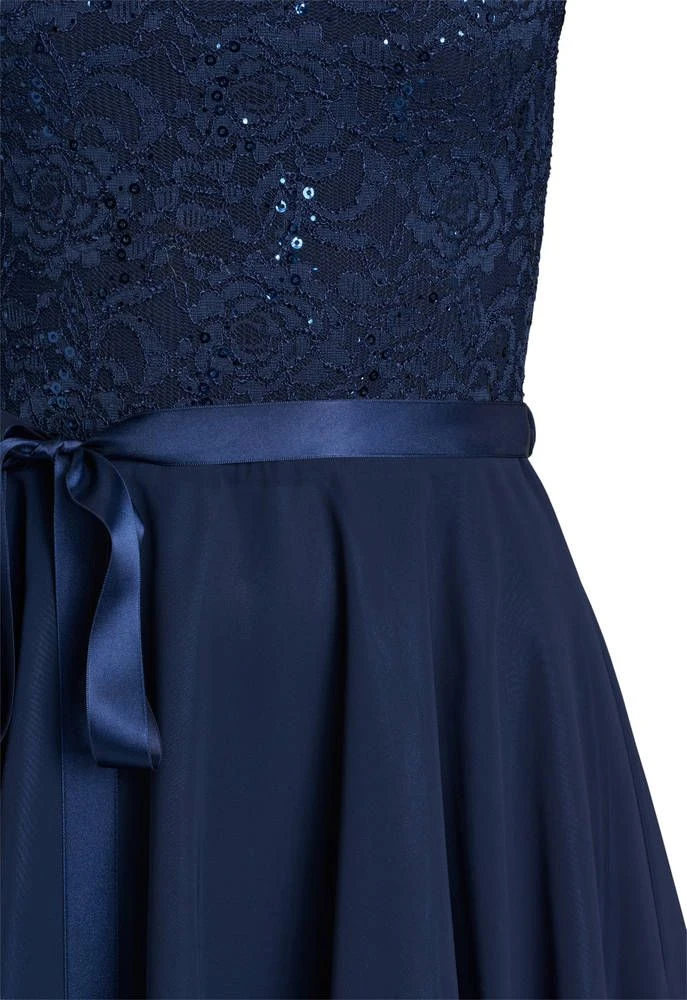 Ihana kellomekko pienillä hihoilla. Yksivärisessä mekossa on pitsinen yläosa ja leveä sifonkihelma. Yläosassa on lisäksi näyttävät paljettikoristeet.