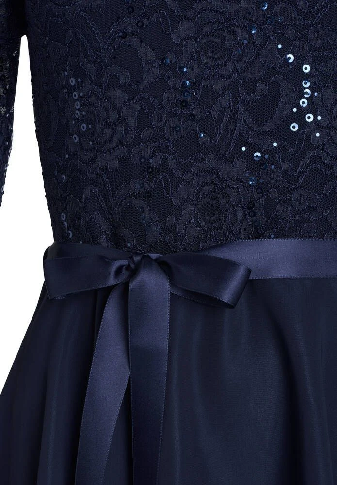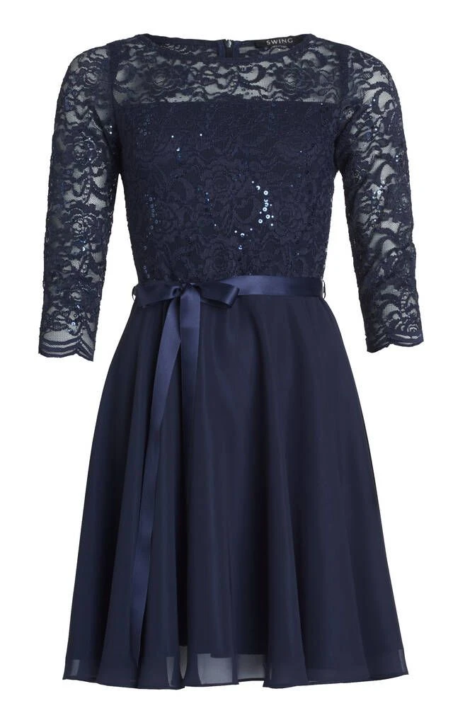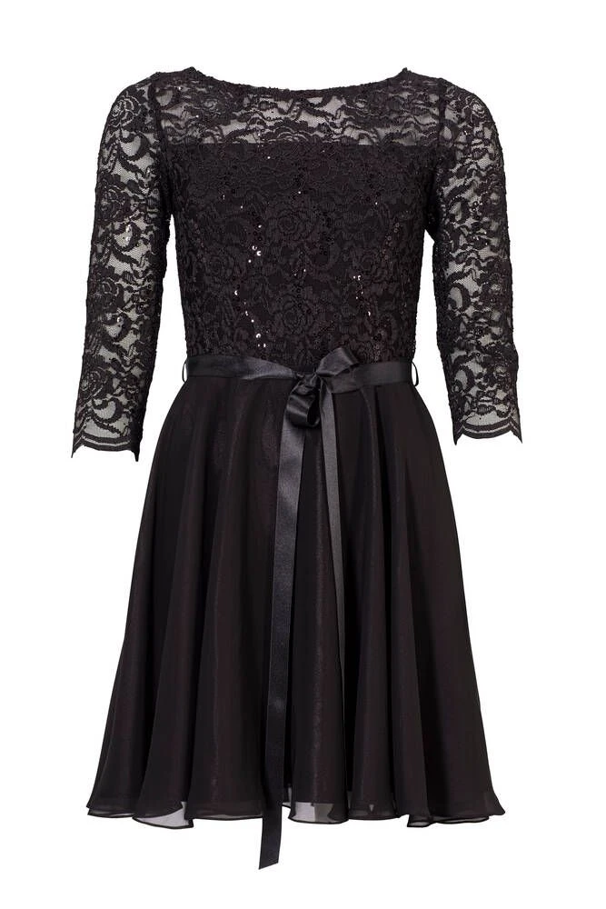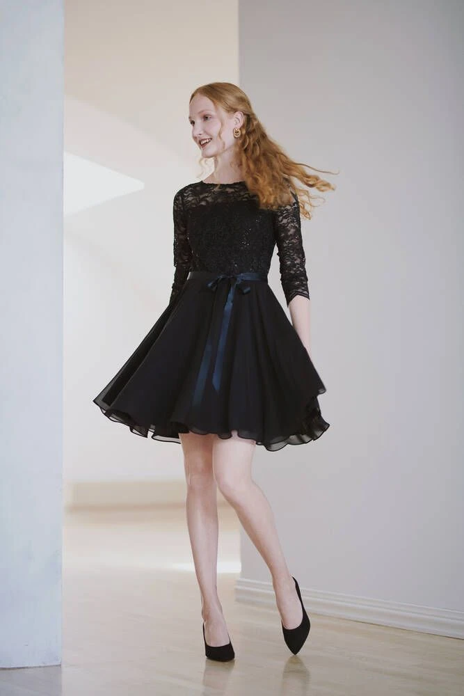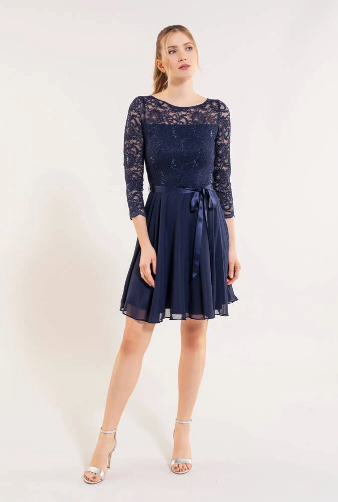 Lyhyenmallinen mekko pitsisellä yläosalla ja sifonkisella kellohelmalla. Mekossa on avara pääntie sekä vajaamittaiset pitsihihat. Pukemista helpottaa selkäpuolen piilovetoketju. Vyötärön solmittava satiinivyö viimeistelee kokonaisuuden.