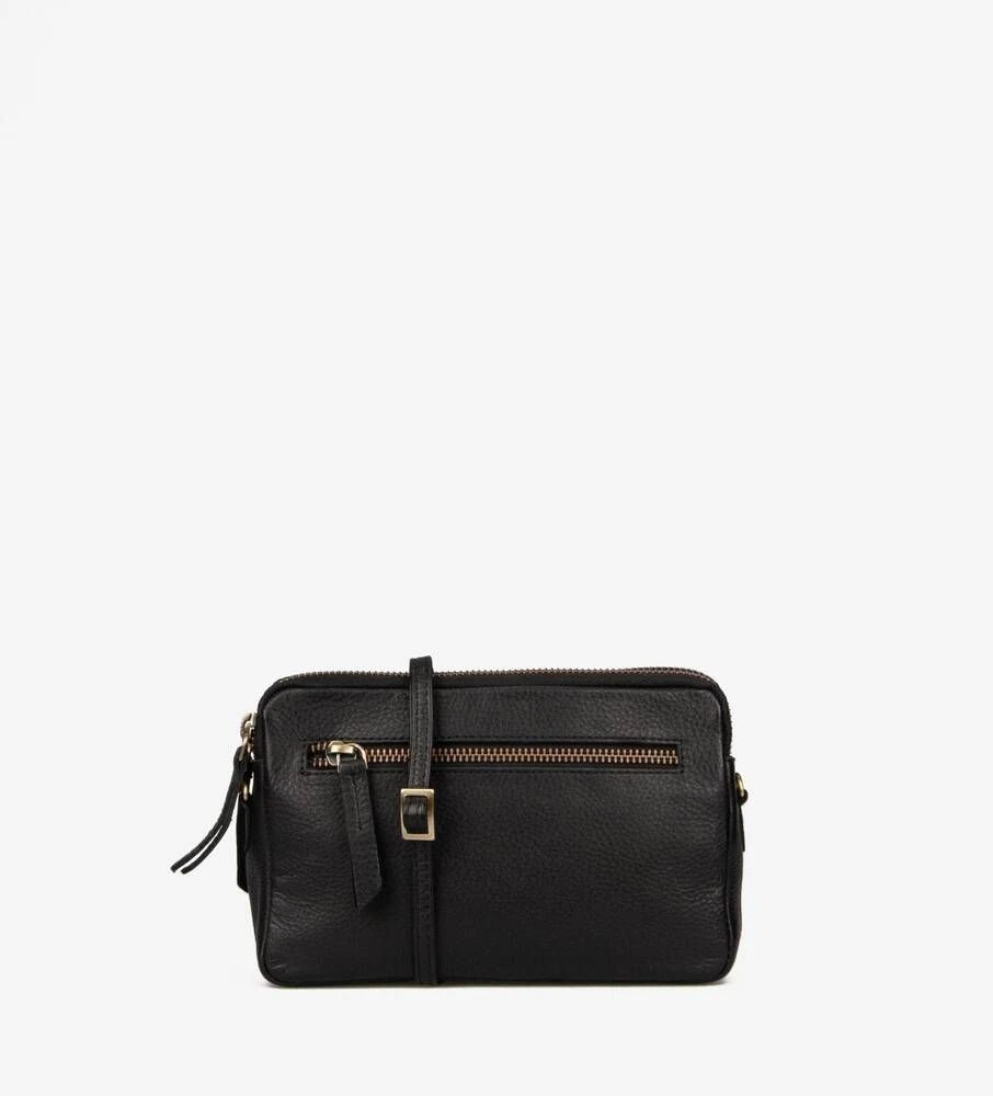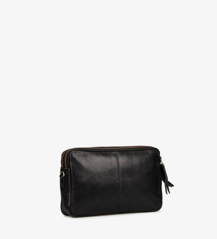Nahkapintainen crossbody-laukku säädettävällä olkahihnalla.