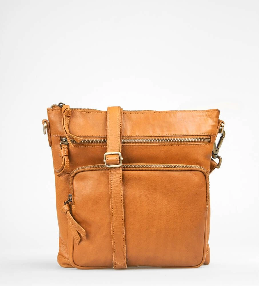 Nahkapintainen laukku säädettävällä olkahihnalla.