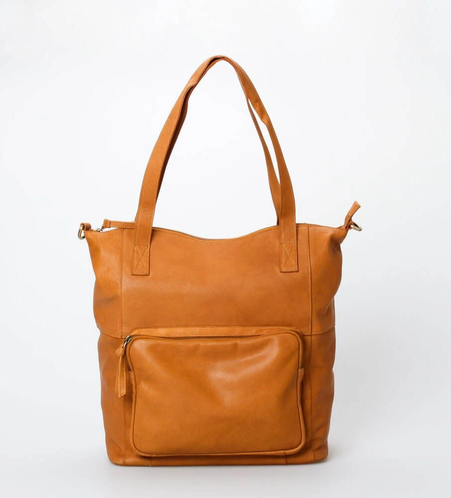 Nahkapintainen olkalaukku käsikahvoilla sekä säädettävällä ja irrotettavalla olkahihnalla.