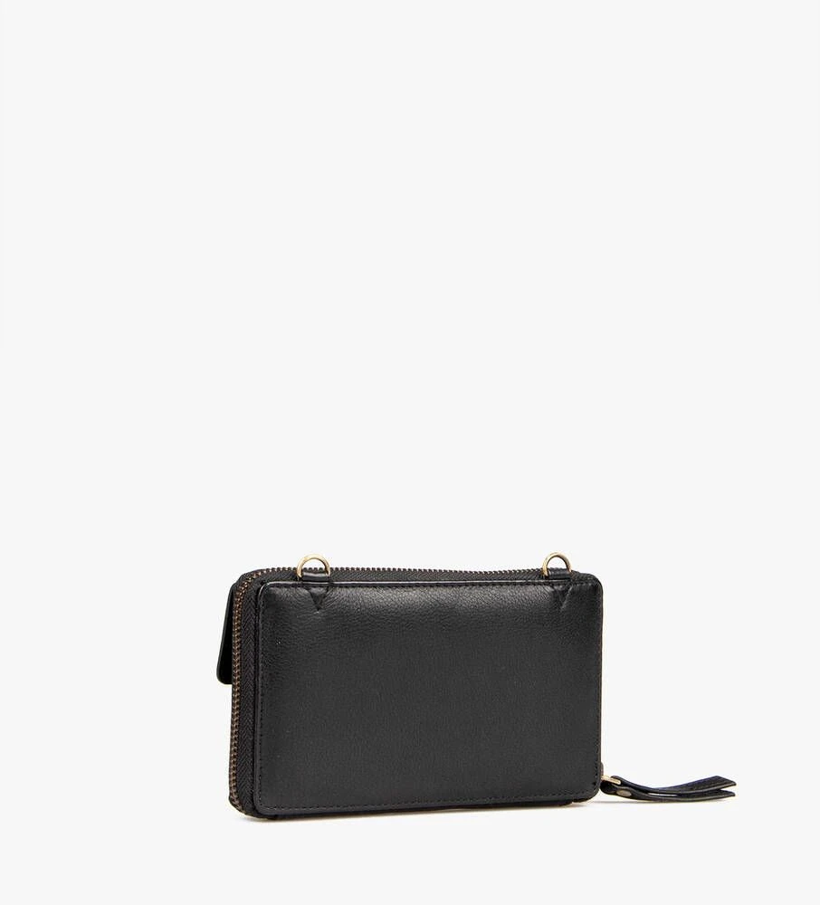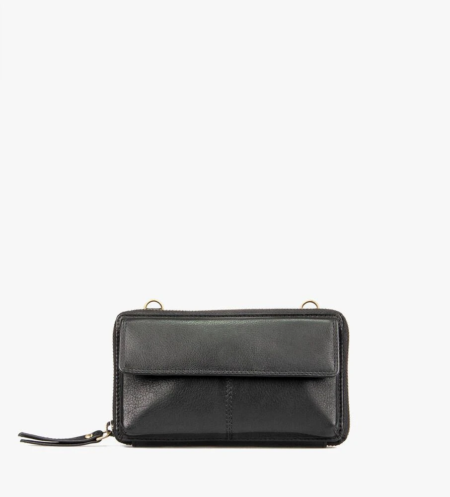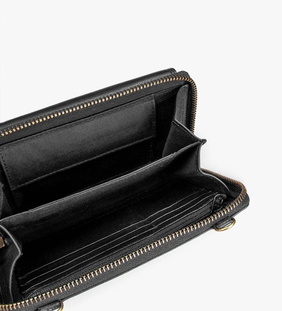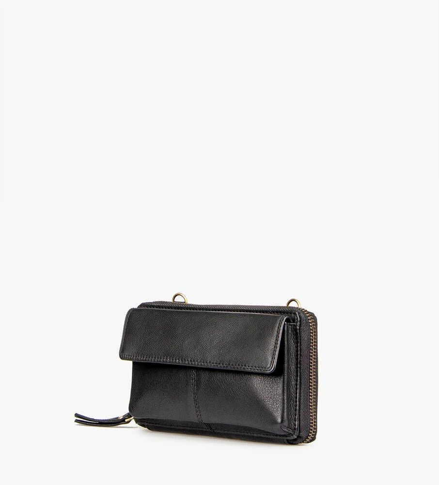 Nahkapintainen lompakkolaukku kapealla olkahihnalla.