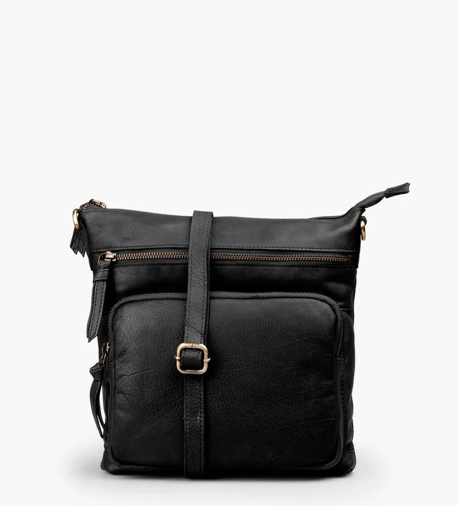Nahkapintainen olkalaukku säädettävällä ja irrotettavalla olkahihnalla. Laukun etupuolella on vetoketjullinen ulkoneva tasku.