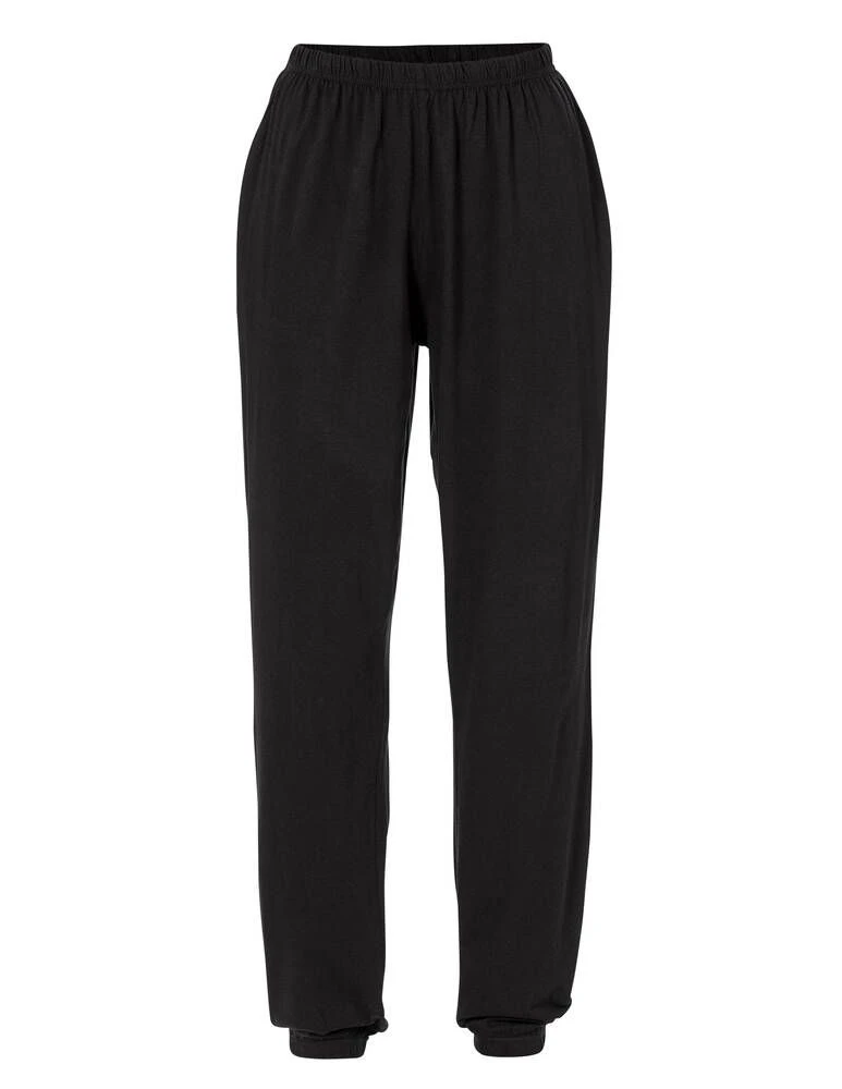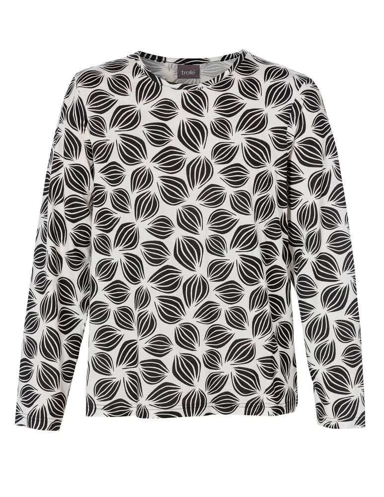 Naisten pyjama pitkähihaisella printtiyläosalla ja yksivärisillä housuilla. Housuissa on mukava kuminauhavyötärö.