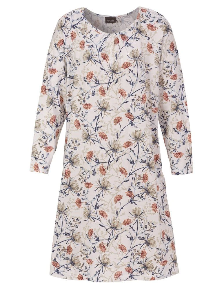 Midimittainen yöpaita pitkillä hihoilla. Kaunis kukkakuosi viimeistelee kokonaisuuden.