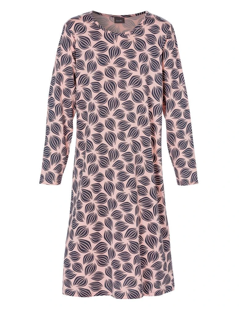 Naisten pitkä yöpaita printillä ja pitkillä hihoilla.