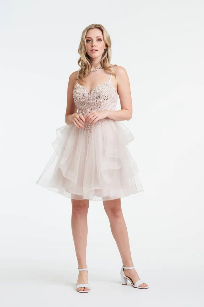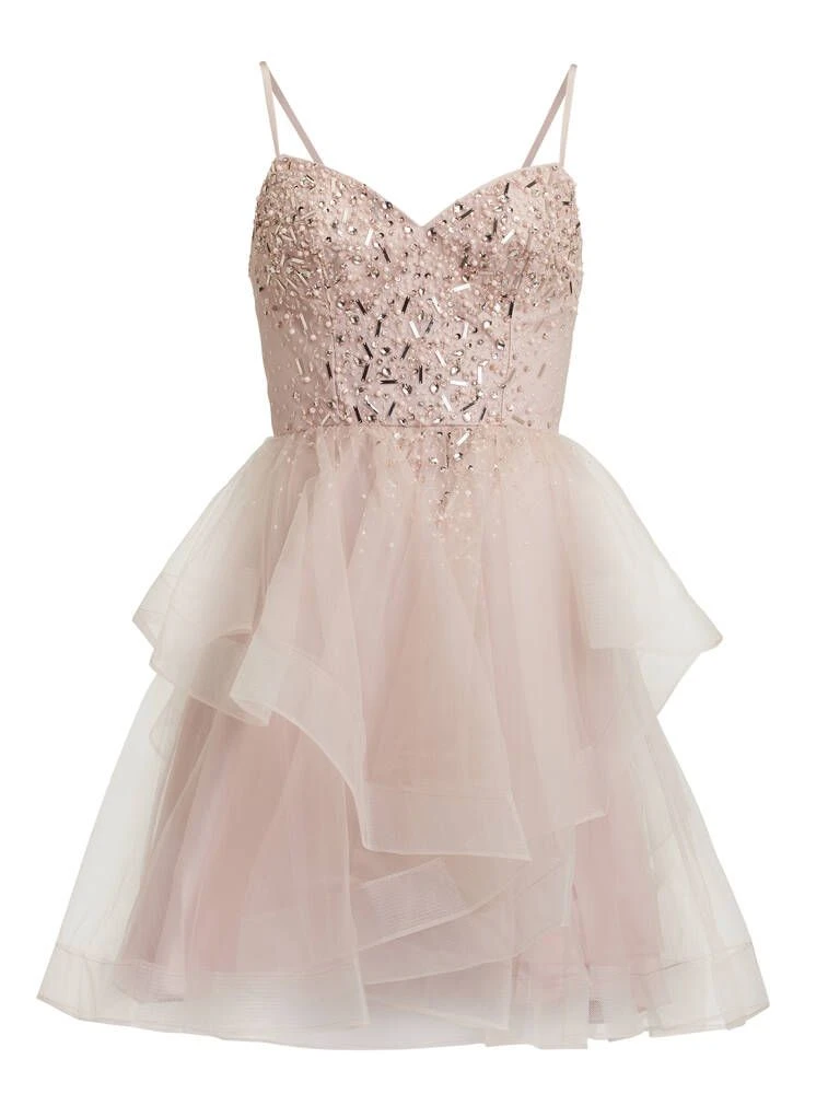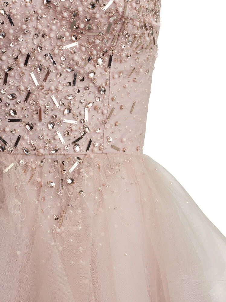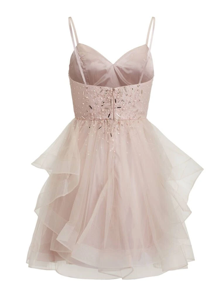 Upea tyllimekko strassein koristellulla yläosalla ja epäsymmetrisellä helmalla. Mekossa on kapeat olkaimet sekä pukemista helpottava vetoketjukiinnitys selkäpuolella. Mekon mukana tulee helman sävyinen mesh-kankainen huivi.