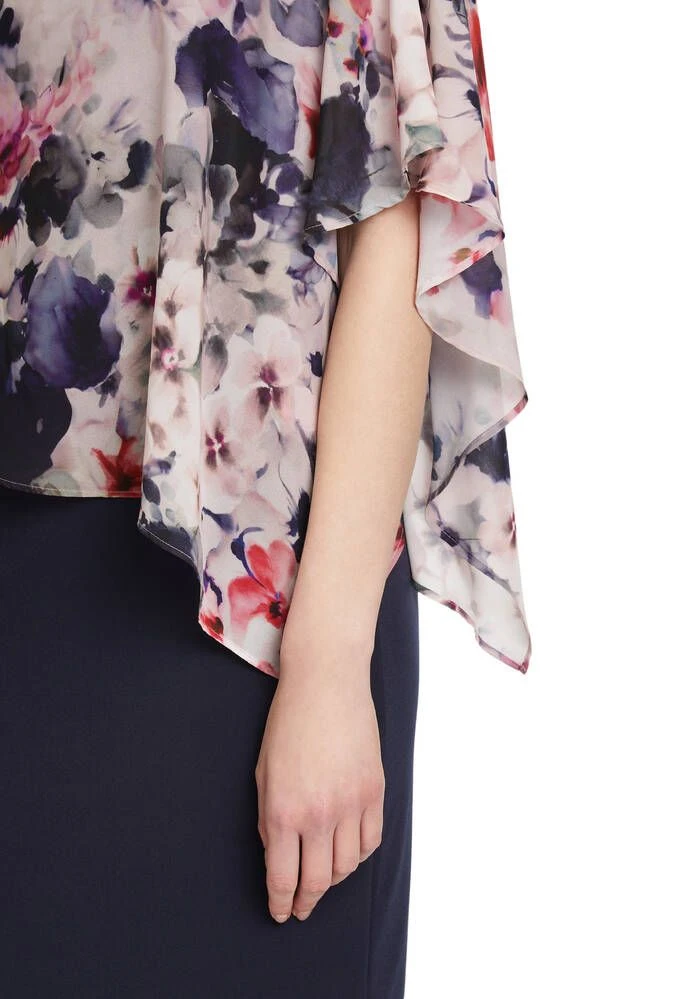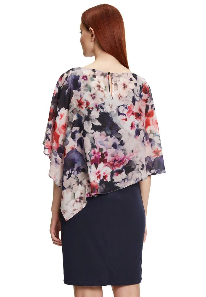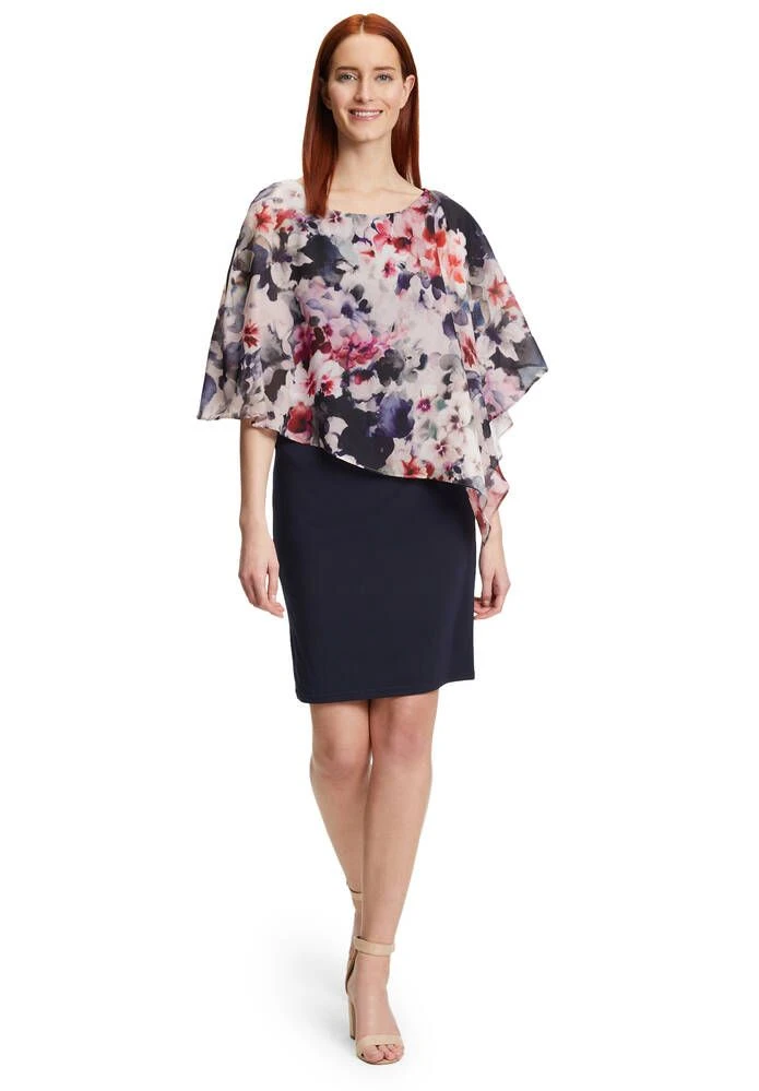 Naisten juhlava kotelomekko, jonka päällä on kukallinen sifonkiponcho.