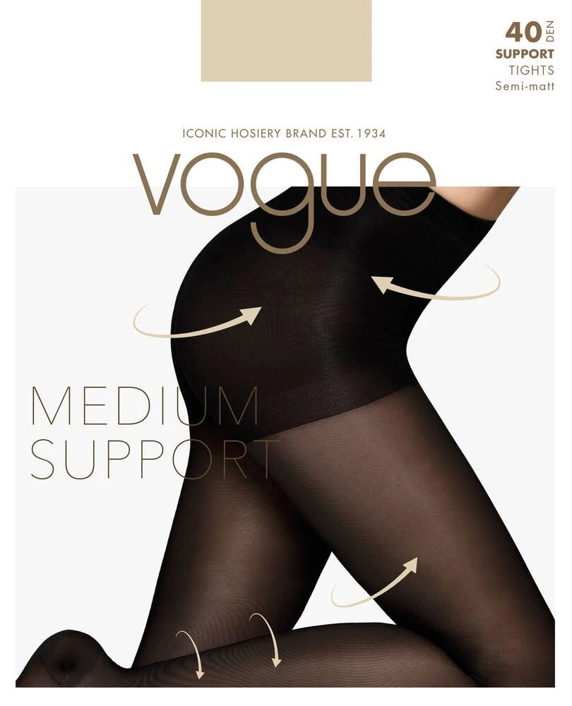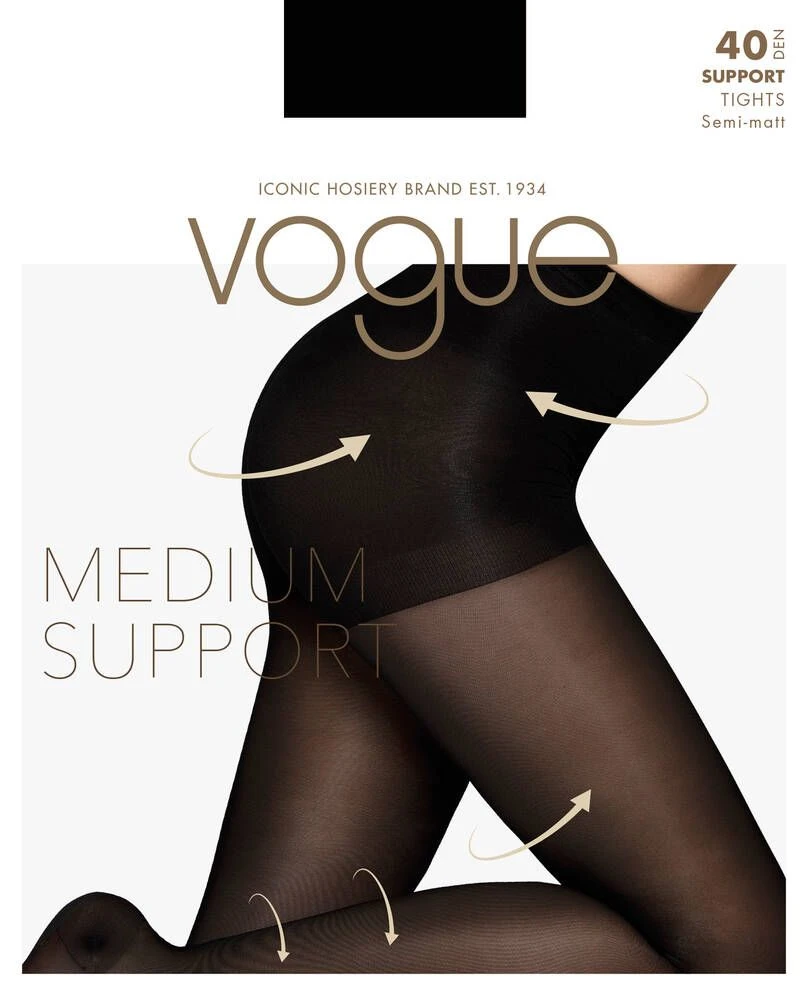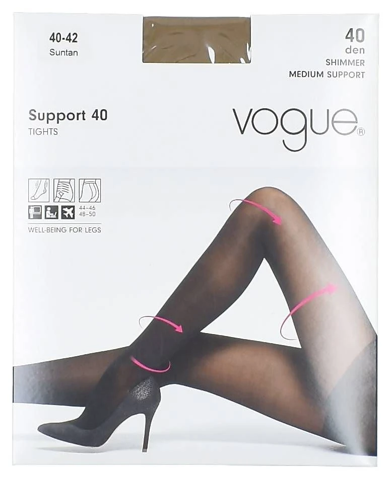 voguen 40 denierin himmeäkiiltoiset tukisukkahousut. Näissä keskivahvan tuen sukkahousuissa on asteittain muuttuva tuki, joka elvyttää jalkojen verenkiertoa. Sukkahousuissa on tukeva Control top-housuosa. Housuissa on tasosauma sekä puuvillahaarakiila ja kahdessa isoimmassa koossa myös takakiila.